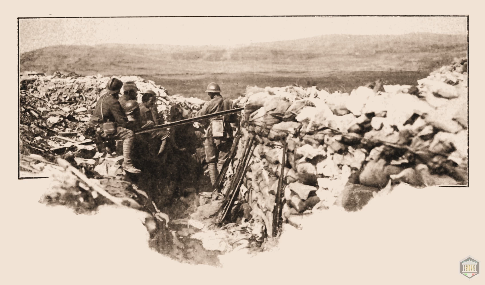 ■ Allora siamo corsi anche noi ai ripari: abbiamo strisciato per terra, ci siamo sprofondati nel suolo con trincee, camminameati, gallerie, caverne: abbiamo disteso reticolati, gettato cavalli di Frisia, abbiamo apprestato ogni sorta di armi difensive ed offensive, richiamando in onore elmo e pugnale, imbracciando lo scudo, adoperando ramponi, fiocine, bombarde, lancia-ruote, lancia-bombe e lancia-fiamme ed ogni sorta di macchine e di congegni. Contemporaneamente adottavamo bombe a mano e fucili automatici; aumentavamo le mitragliatrici in misura non mai pensata. Invece il fucile tendeva sempre più a scomparire in secondo piano; tanto che durante le ultime azioni si ebbero più di una volta assalti «a ferro freddo»: il pugnale fra i denti, una bomba in ciascuna mano, e il tascapane pieno di altri ordegni di morte.