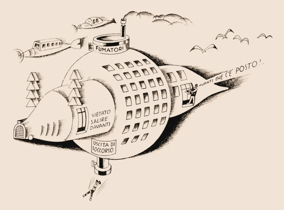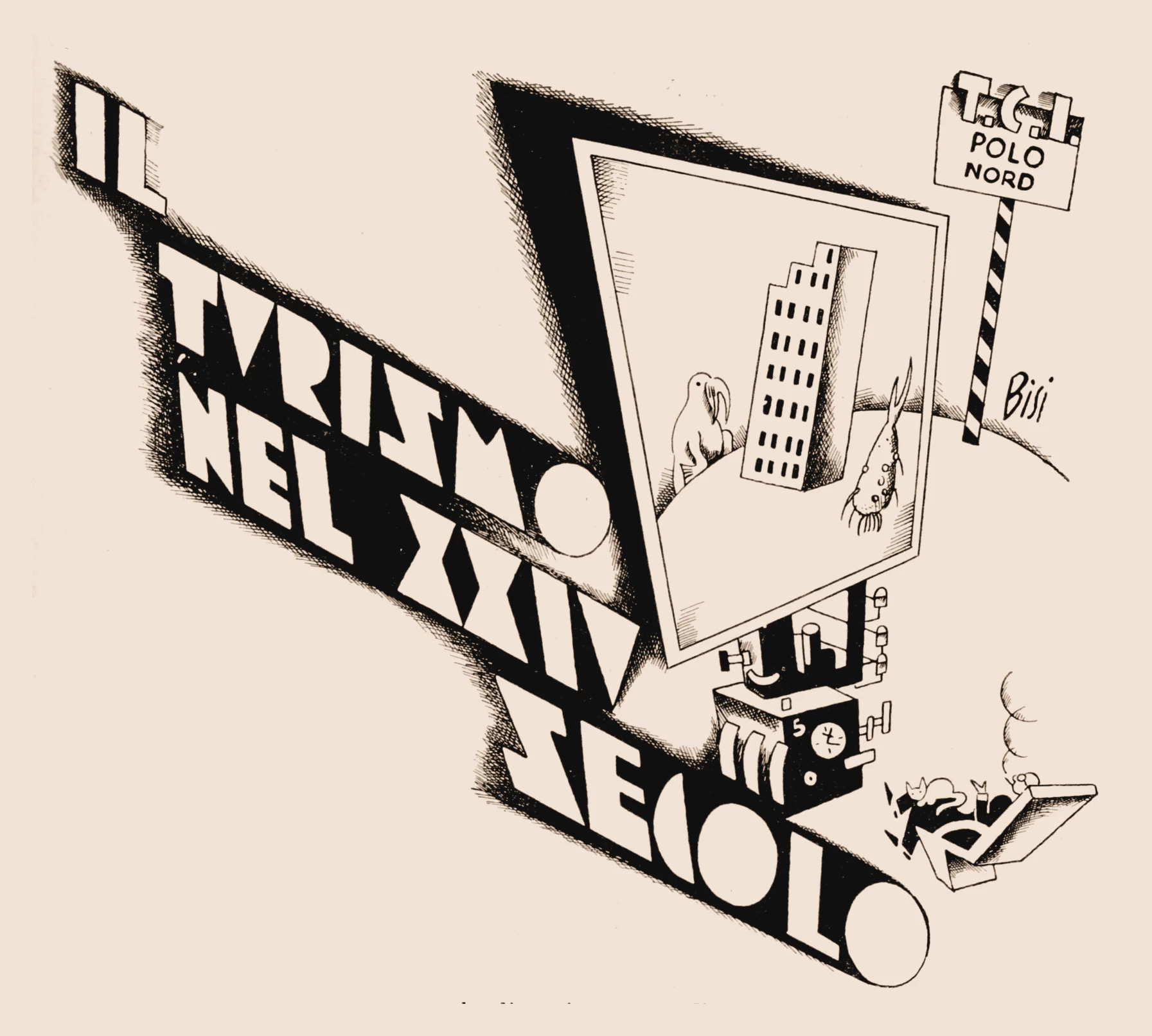 ■ «L’uomo del secolo XXV sarà dunque l’uomo in poltrona? «Purtroppo, la scienza medica, una volta nostra alleata, che predicava le sane gioie del moto, dell’aria libera, dei mutamenti di clima, e poteva così spaventare gli inerti col quadro dei cento mali fisici della vita sedentaria, la scienza medica ora offre i suoi servizi alla poltroneria! Grazie agli apparecchi per la produzione casalinga dei climi artificiali, grazie alle facili applicazioni dei raggi KZ, dei raggi fisiocosmici, dei raggi ipergialli, ognuno può prevenire gli acciacchi della vita sedentaria. ■ «Ma non sconteranno poi le generazioni future quest’orgia di radiazioni, questa fisiologia adulterata, questa vita artificiale? ■ «Tali tremendi pericoli, che minacciano tragicamente il domani della razza, ci spingono a intensificare sempre più la nuova campagna del T.C.I.: Per il moto e per la vita naturale! ■ «E basta con le poltrone pneumatiche e con gli uomini-ostrica!». ■ Il quadro è davvero deprimente, e non possiamo a meno di applaudire, con 436 anni d’anticipo, a questo nostro Touring sempre benemerito, sempre glorioso.