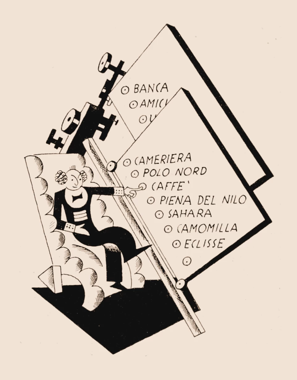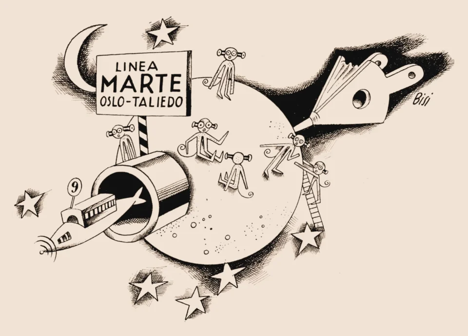 ■ «Pochi superano la naturale pigrizia umana, per sobbarcarsi alla noia di recarsi in aerotassì al vicino razzoscalo, accomodarsi sul sedile pneumatico dell’elicorazzo da crociera, e affrontare qualche ora di stratosfera, per dare una capatina alle gare di iceberghismo accademico o di tiro al tricheco, al Polo Nord, oppure all’inaugurazione del nuovo lago-serbatoio nel Sahara. Spesa, rischio, perdita di tempo, per piccoli che siano, superano di gran lunga ciò che occorre nella panvisione casalinga. ■ «E poi, per i topi di biblioteca, ci sono i libri fotosonori, coi quali è così facile assistere agli avvenimenti di cinquanta, ottant’anni fa, rivedere l’eruzione del Monviso, l’arrivo del primo convoglio etereo dei Marziani, gli episodi dell’invasione nipponica in Patagonia, e così via. ■ «Tutte bellissime cose, se anche ormai risapute e viste e riviste. Ma il risultato, purtroppo, è chiaro: la decadenza irreparabile del turismo!