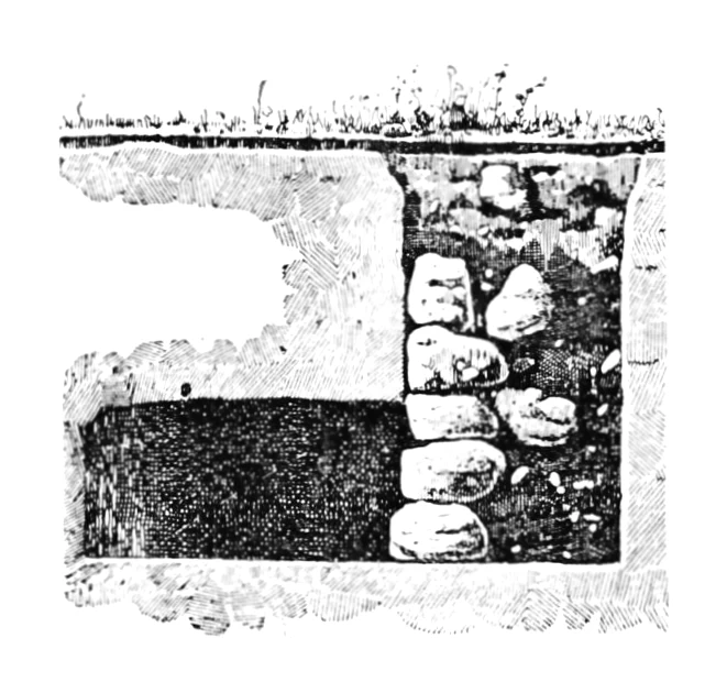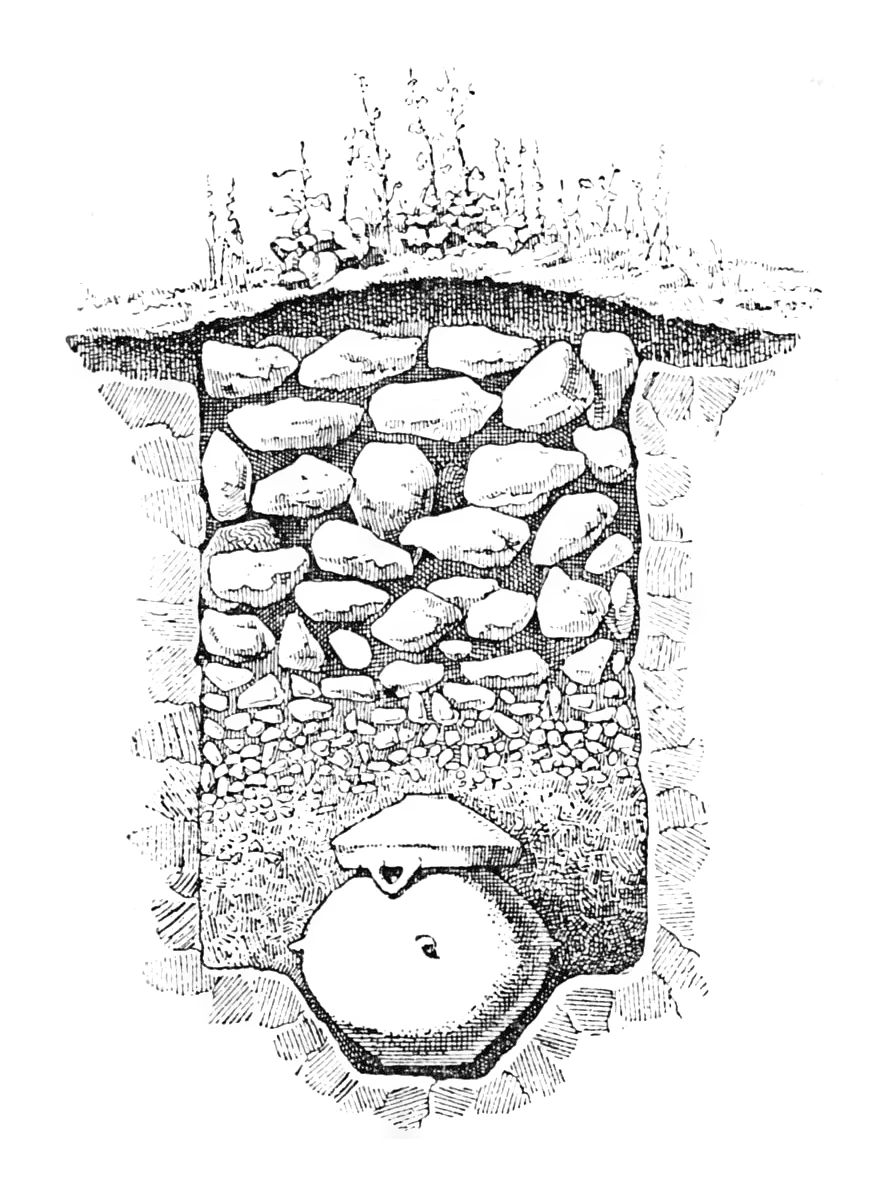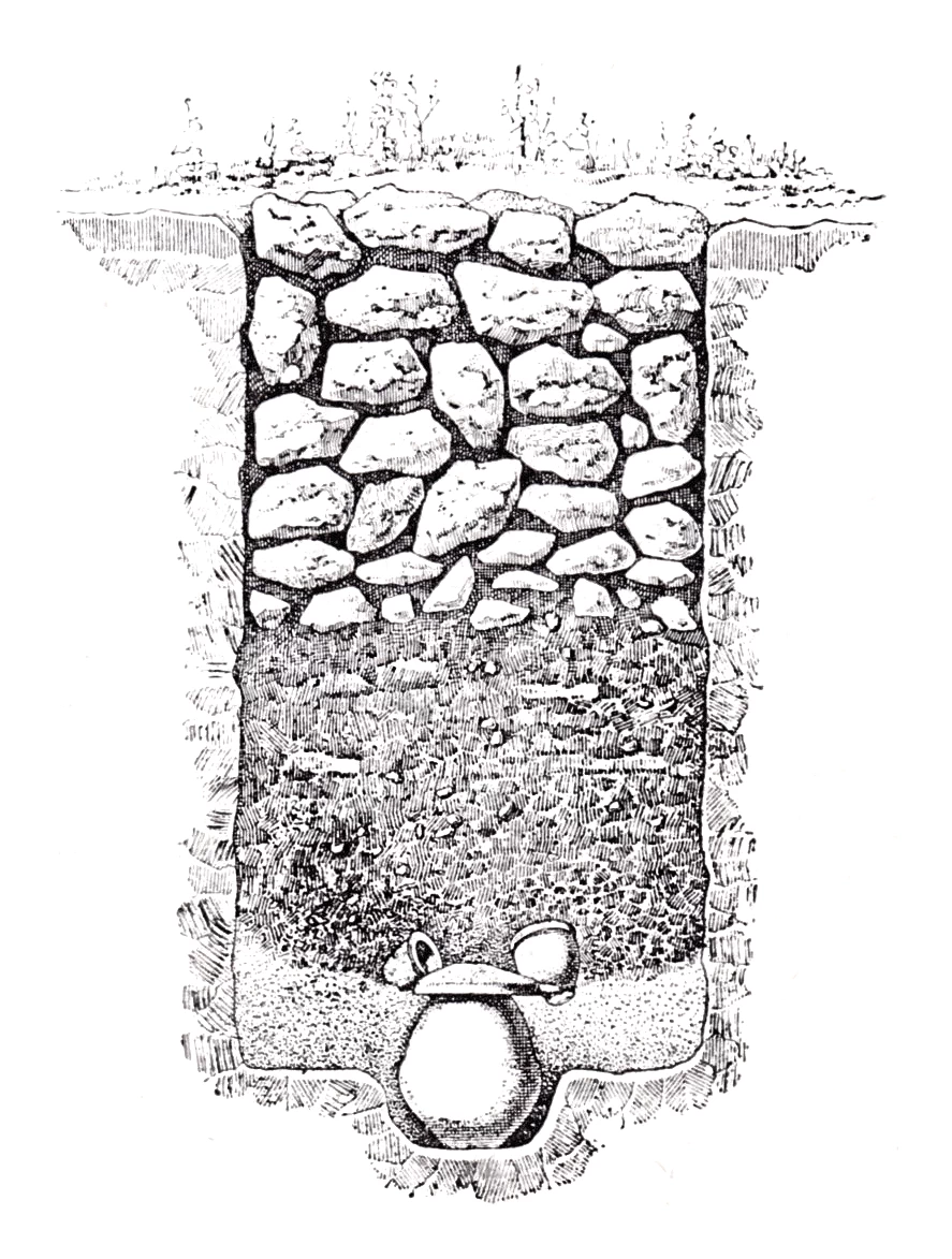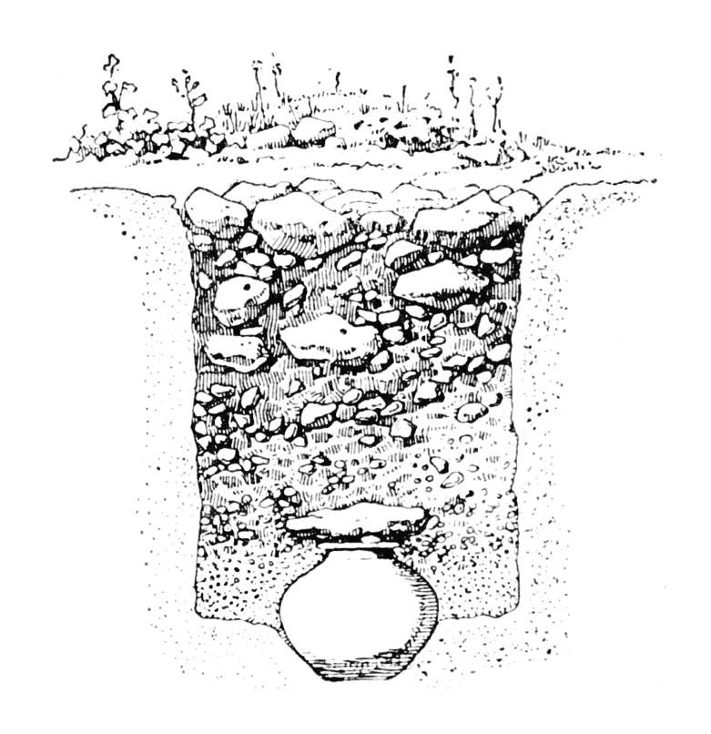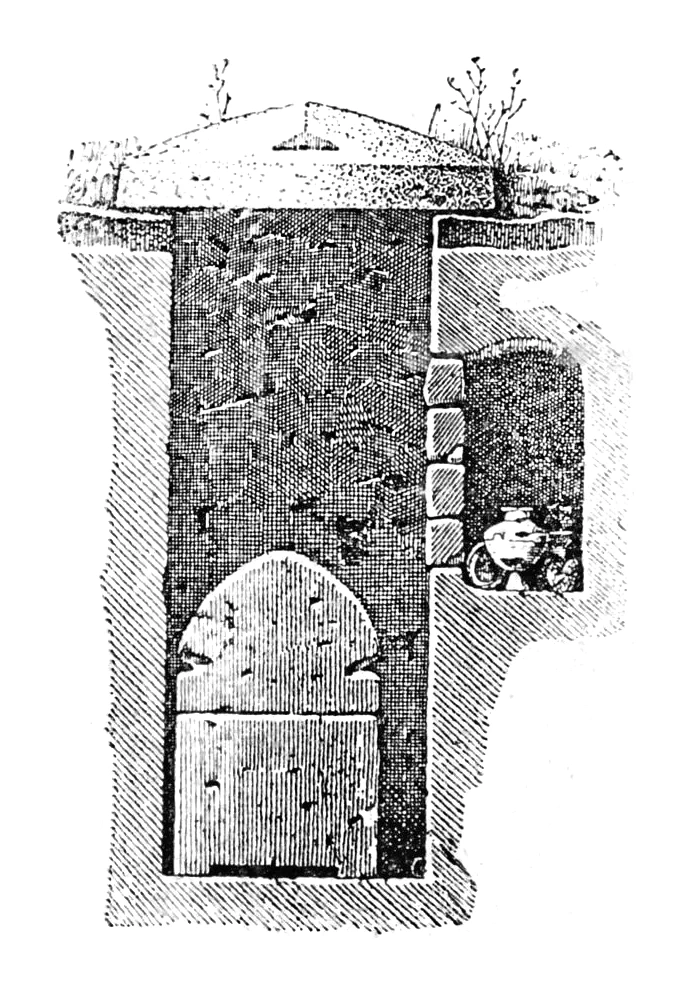 ■ Nella figura 3 si accentua una maggior difesa delle ceneri: l’urnetta fittile, colla sua chiusura, anziché appoggiata sulla terra, è raccolta entro un recipiente di tufo, a sua volta coperto da una grossa pietra. Su di questa era inutile la terra fina, o terra impastata di calce come nei pozzetti sopradescritti, e il riempimento si faceva di grosso pietrame.