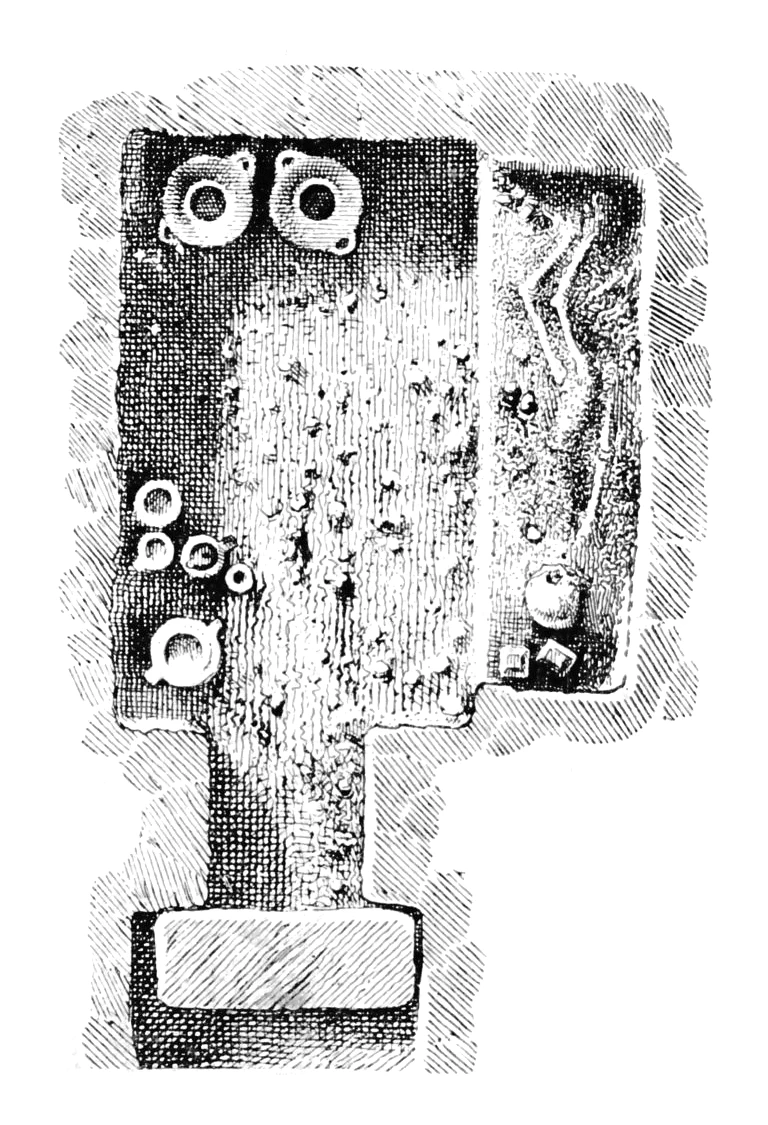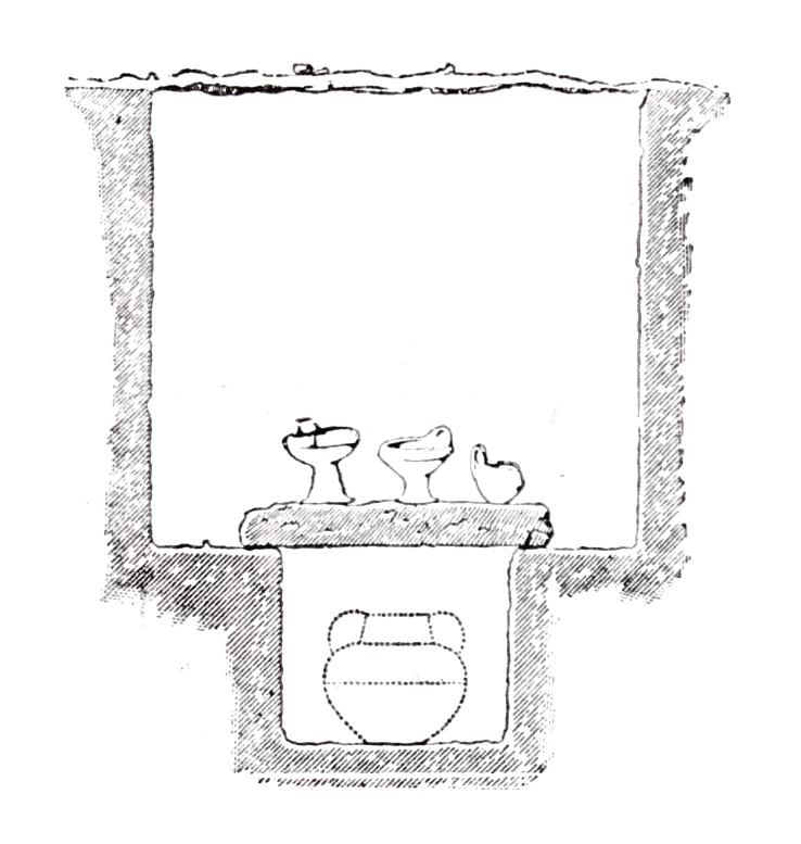 ■ Questo passaggio dalla forma sepolcrale di fossa a quello di camera è ancor più marcato in un tipo raro di tomba di cui dà esempio la figura 16. In esso ciò che era la fossa mette a una specie di porta, chiusa con un lastrone, e questa a una camera presso a poco elittica, con una volta che simula l’interno di una capanna e con un piano di circa 2 metri in ciascun senso. Sul piano sono disposte delle pietre (che si vedono bene nella figura 16) in modo da determinare il posto del cadavere, lasciando intorno lo spazio per la suppellettile (si vedono i vasi nel fondo della stessa figura).