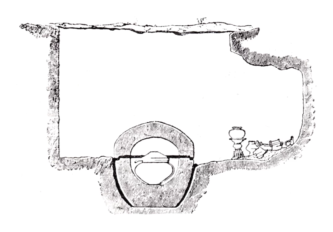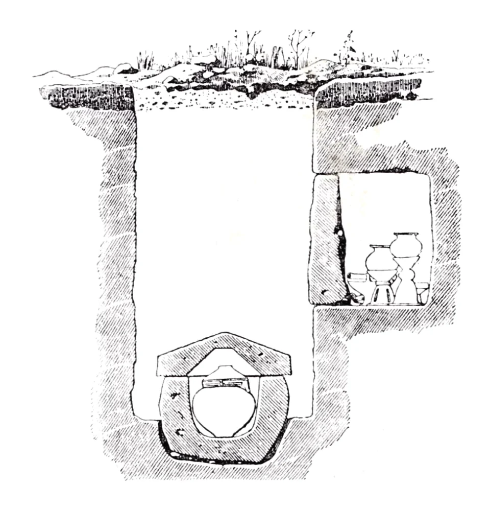 ■ Vi era dunque fra i due primi tipi (pozzetto e fossa) e il terzo (camera) la stessa differenza che al giorno d’oggi nei nostri cimiteri intercede fra la tomba isolata di cadaveri seppelliti nella terra e quella di famiglia che, a seconda dell’epoca del loro decesso, riunisce le spoglie di più persone nella stessa tomba comune.