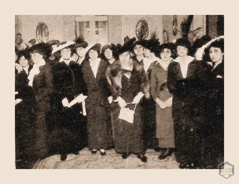 ■ Accolgono con sorrisi la gioventù balda e vigorosa nobili donne e gentili fanciulle; le principesse Liminetti-Fava, ed Hercolani; la duchessa Bianconcini di Mignano; le contesse Zucchini, Acquaderni, De Franchis, Bosdari, Rossi; le marchese Morozzo della Rocca e Tanari; le signore Besmaroli-Calderi, Cosentino, Certani, Carnevali, Sarti, Scotti, Palmeggiani, Perego, Costa, Zampa, Guidastri, Grimaldi, Gandini-Bonola, Masi ed altre numerose intellettuali e belle ed eleganti fanciulle gentili e svelti boy-scouts fanno con grazia e signorilità gli onori del novello ritrovo. L’avv. Roffeni Tiraferri, valente oratore, suscita entusiastiche acclamazioni dicendo maestrevolmente delle ragioni molteplici, storiche, etniche ed umanitarie, di questa nostra ultima nobilissima guerra e della mèta luminosa che i soldati d’Italia sono fieri, sono frementi di raggiungere.