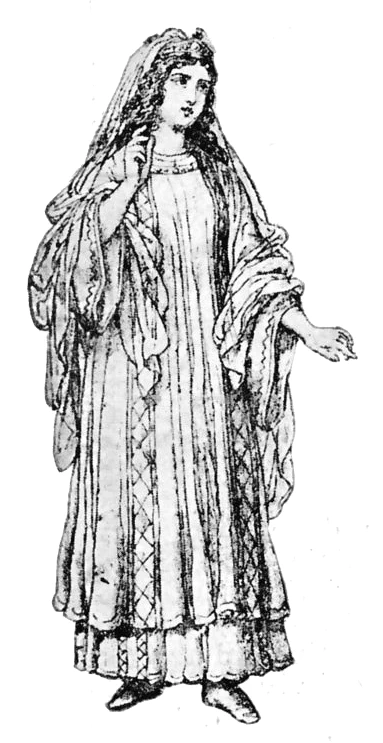 ■ L’abbigliamento cominciò a rendersi più complesso e si compose di una sopravveste lunga un po’ strascicante e larga così da lasciare appena indovinare le forme e d’un vestito accollato, adorno d’una specie di rotonda ricamata. Doppie erano le maniche, le esterne aperte e scendenti a punta sin oltre il ginocchio, le interne strette e chiuse al polso: entrambi spesso di colore differente da quello del busto.