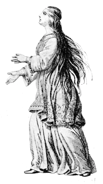 «Le donne hanno vesti lunghe e larghe di velluto e drappo serico con cinture d’oro e d’argento, con maniche pure larghe e lunghissime che, dopo aver coperto buona parte della mano, foggiandosi a punta dalla parte di fuori, scendono sino ai piedi. Su queste vesti, alcune innestano da quattro sino a quindici once di perle, e larghi orli d’oro aggiungono intorno al collo ed al basso delle maniche, sia della sopravveste che della veste di sotto. Copronsi il capo con veli di seta o di cotone finissimo, con piccoli cappucci che fanno ala alle guance e splendono da lungi per le guarnizioni di perle ed oro; hanno anche corone d’argento, d’oro e di perle che intrecciano nei capelli. Le corone di perle che si dicono terzuole, compongonsi di 300 magnifiche perle disposte a tre file: i loro capelli, divisi a ciocche ed arricciati, sono adorni di spilloni preziosi; le dita sono cariche di anelli; collane d’ambra o di corallo pendono sul petto. Le matrone indossano ampi mantelli circolari, onde avvolgonsi tutta la persona e le giovani hanno mantelletti corti; gli uni e gli altri trattenuti da ricche bottoniere con bottoni di perle ed oro, ecc.».