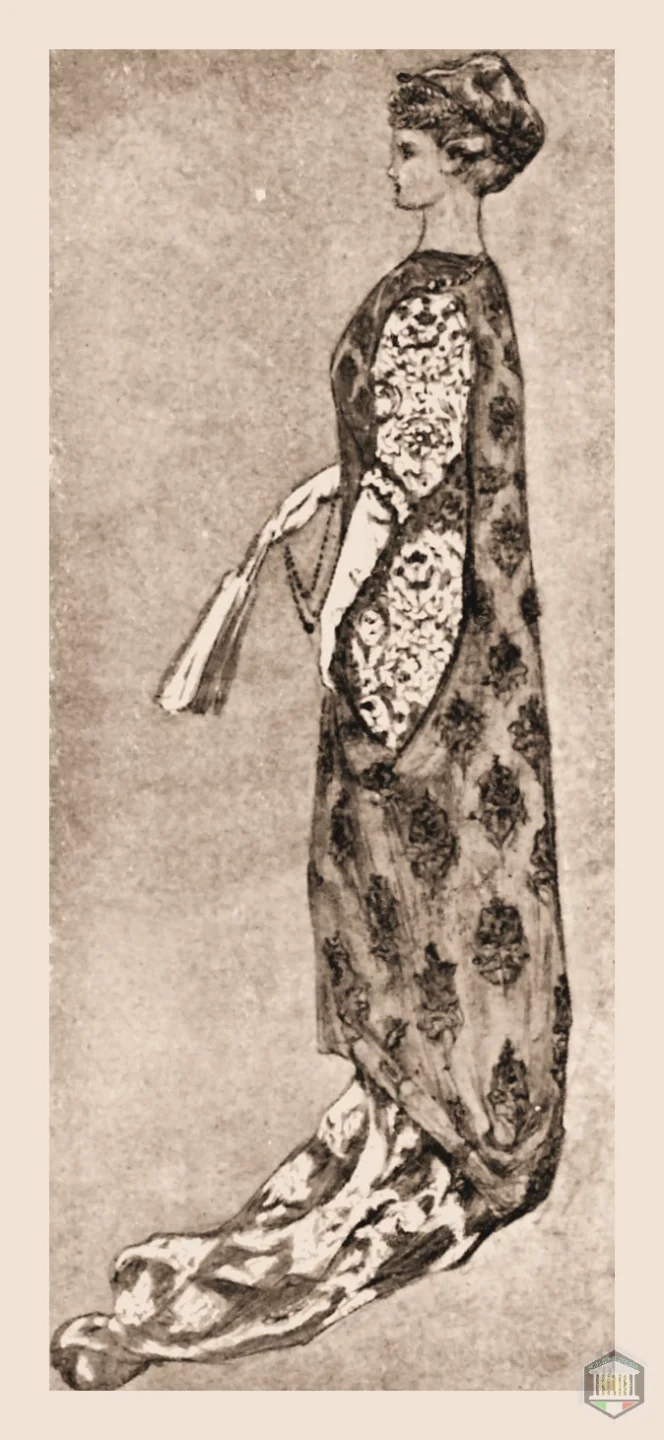 ■ Parigi affascina e comanda regalmente al mondo della moda e quest’imperio viene riaffermato e reso più tirannico nella successiva febbrile epoca borghese ed industriale. Anche oggidì le nostre signore ne sono completamente dominate e continueranno ad esserlo, se la diana della riscossa fatta squillare dai nuovissimi rivoluzionari e dalle patriottiche innovatrici della moda non troverà seguaci nel gentile esercito della bellezza e della grazia femminile italiana.