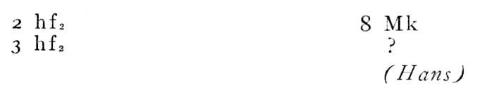 ■ Fu presentato a un cavallo (mi pare Muhamed), il ritratto di una ragazza, domandandogli che cos’era. Il cavallo compitò Mädchen (ragazza). Gli fu poi domandato perché avesse detto che quella era una ragazza. Il cavallo rispose: capelli lunghi (cioè: «perché ha i capelli lunghi»). Gli fu domandato anche se vi fosse un’altra ragione per distinguere una ragazza da un uomo e il cavallo rispose: (perché) non (ha i) baffi.