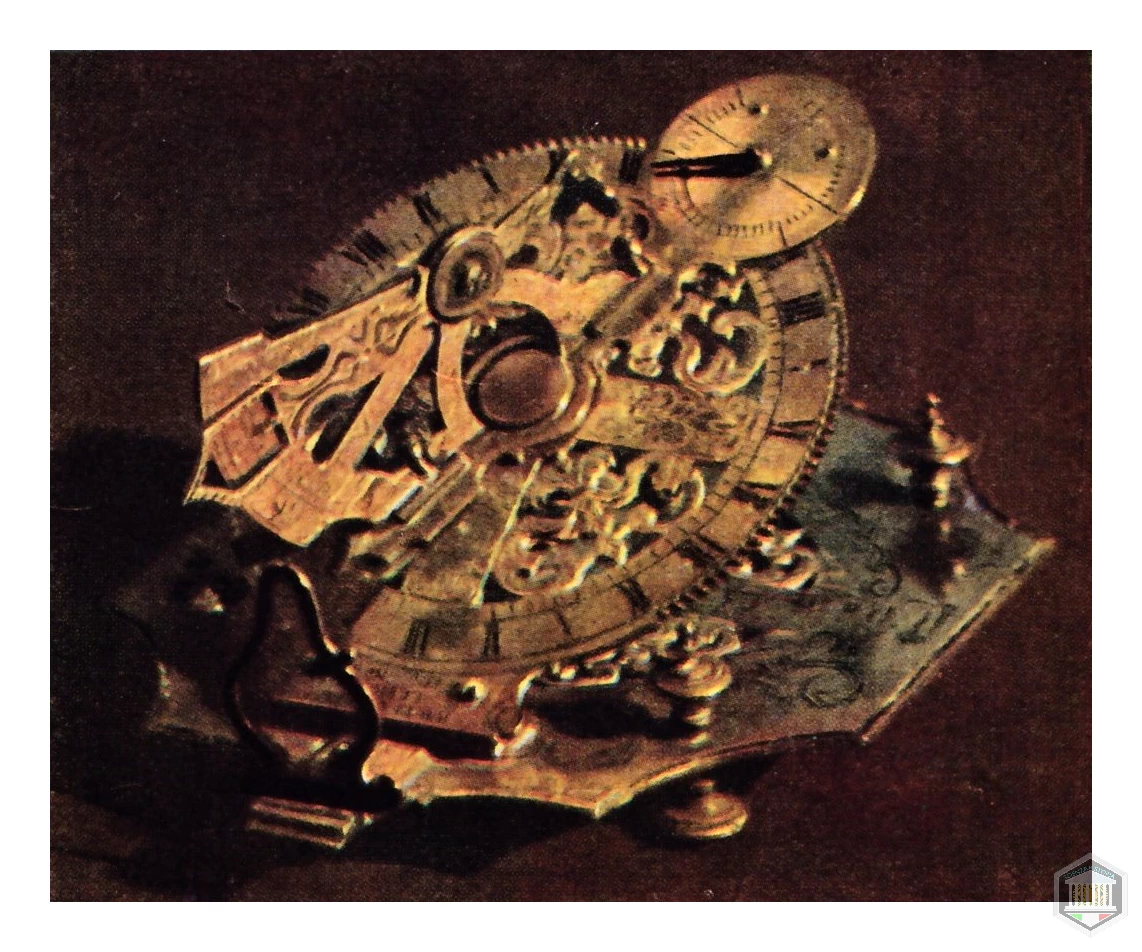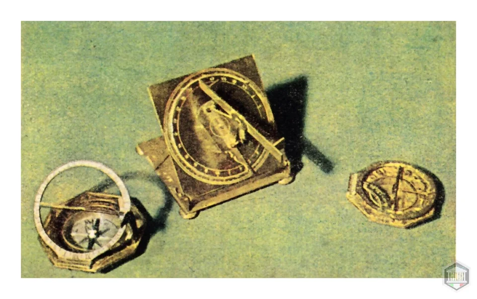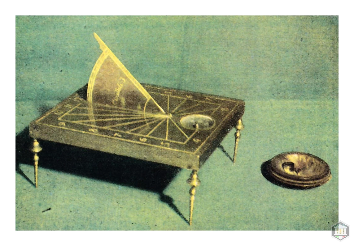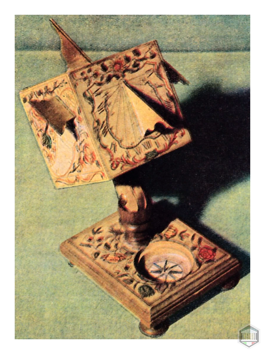 ■ L’invenzione della bussola iniziò un periodo aureo per l’orologio solare tascabile e da appoggio, ché era facilitato l’orientamento. Si applicava una piccola bussola all’orologio, e non c’era che da spostarlo in modo che la lancetta fosse rivolta in una data direzione. Queste meridiane lillipuziane venivano costruite nelle più diverse fogge e in diversi materiali, persino in argento e oro, sì da costituire pregevoli pezzi di valore intrinseco e artistico.