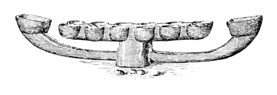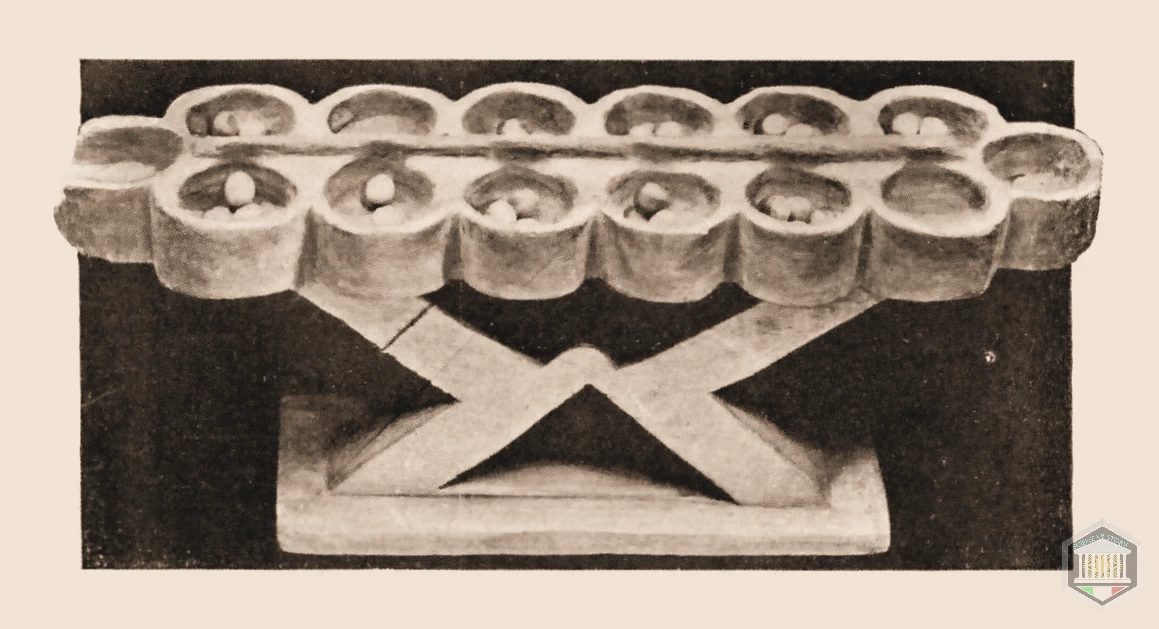 ■ Viceversa in Abissinia un viaggiatore ne osservò di quelli costrutti con escrementi bovini induriti! Laggiù il giuoco, che un ambasciatore portoghese già vi trovò nel 1520 col nome di mancal, si fa su tre file di sei caselle e si chiama ora gabattà. Si può dire, del resto, che ogni tribù ha la varietà propria, con diverso numero di buche e nomi diversi: pu, mbau, oki, abangah, mungala, ecc. Nel Mascionaland, ove si chiama isafuba, il giuoco è fatto su scacchiere enormi, scavate in intieri tronchi di alberi, con sessanta caselle!