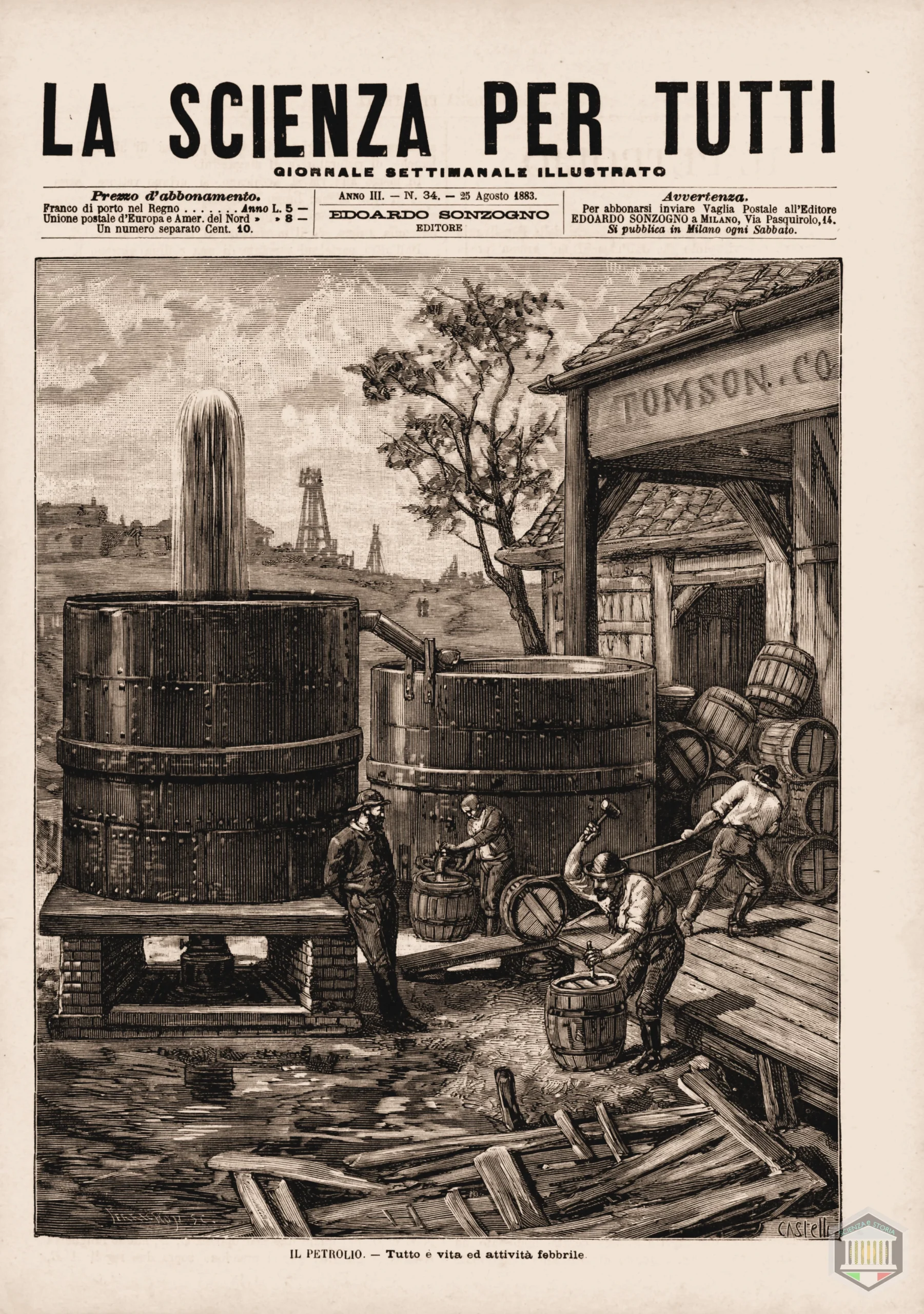 ■ Nel 1864, il territorio del petrolio valeva appena 15 dollari all’acre comprese case e luoghi chiusi, nel 1866 quel prezzo sali ad 80 mila dollari al mezzo acre. Oggi nella Pensilvania-Petrolia esistono 1769 società che coltivano l’estrazione del liquido e dispongono di un capitale di cinque miliardi e mezzo. Strade ferrate e piroscafi solcano il terreno ed i fiumi, le locomotive fischiano lungo i sentieri tracciati in mezzo alle foreste, ed i fiumi altrevolte paludosi sono stretti fra dighe e fiancheggiati da belle case, da palazzi e da magazzini immensi. Tuttavia nel paese del petrolio tutto non è color di rosa, poiché l’atmosfera è sì impregnata di quella materia esplosiva, che è espressamente proibito di fumare, quindi sigaro e pipa sono banditi da tutta la regione.