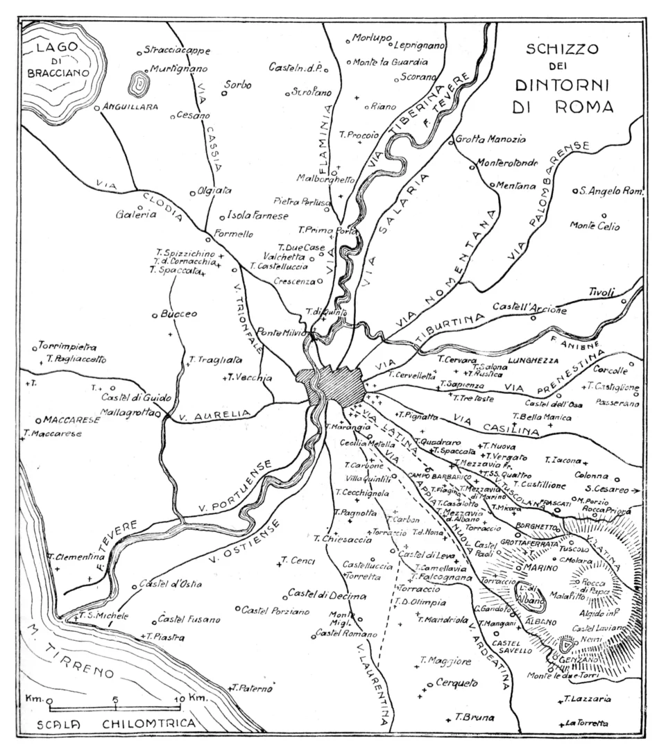 ■ Questa zona (fig. 1), solcata diametralmente dal Tevere, si presenta quasi pianeggiante, salvo a sud-est, verso i Colli Albani, ove il terreno alzasi gradatamente sino al cratere tuscolano, raggiungendo con qualche cima la quota di circa 900 metri. Essa, pur essendo pianeggiante, è molto rotta da burroncelli e marrane, che vi originano una quantità di piccole dorsali e di poggi, i quali in tutti i tempi, dal V secolo dopo C., fornirono buone posizioni per la difesa dei luoghi nelle continue guerre che vi si svolsero. Tali difese, però si raggrupparono maggiormente lungo le strade che la solcavano, a guisa di raggiera tutto attorno alla città.