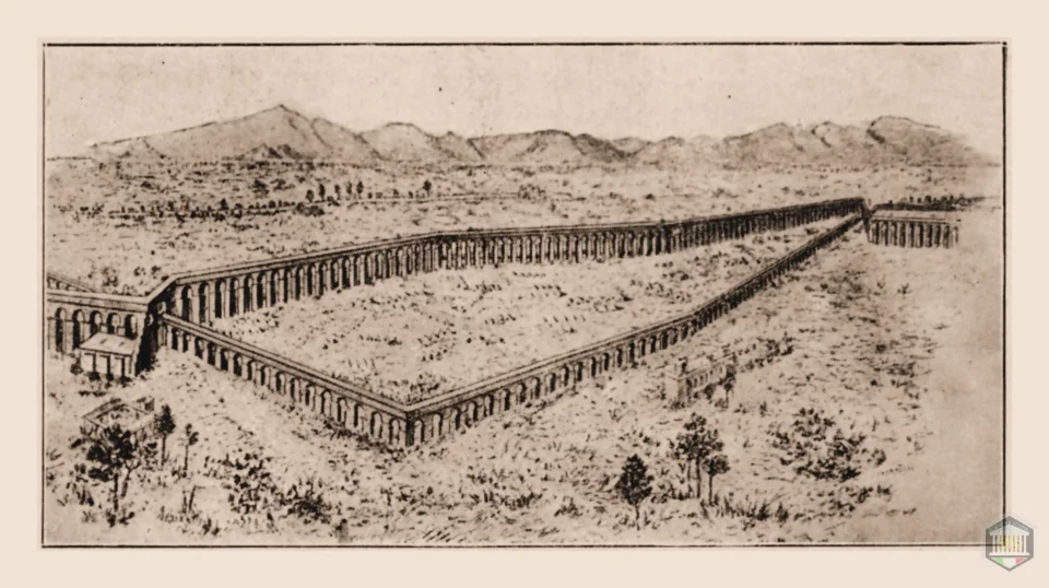 ■ Ma il più antico esempio di fortificazione medioevale nella campagna romana lo si deve ai Goti invasori, quando nel 537 d.C. assediarono Roma, difesa da Belisario. Essi circondarono la città con gruppi di armati, uno dei quali, di circa 7000 uomini, si fermò al quarto miglio della Via Latina, ove oggi sorge Tor Fiscale. Ivi due acquedotti, quello dell’acqua marcia e quello dell’Aniene Nuovo si attraversavano due volte racchiudendo un ampio spazio di terreno di forma allungata. In questo si stabilirono i Goti, che otturarono con sassi ed argilla i fornici degli acquedotti formando così un campo recinto da alte mura, che d’allora fu chiamato campo barbarico (fig. 3). Questo mantenne il suo carattere di fortezza per quasi un millennio, e lo troviamo nel 1084 occupato dalle truppe del Re Guiscardo il normanno; un secolo dopo vi erano truppe romane per difendere gli acquedotti; nel 1277 per rafforzarlo vi fu eretta l’attuale Tor Fiscale, tuttora alta 30 metri con base quadrata, e divisa in tredici piani da solai di legno; poscia fu occupato dalle truppe di Re Ladislao e nel 1482 da quelle di Papa Sisto IV. Dopo tale epoca andò in rovina.
