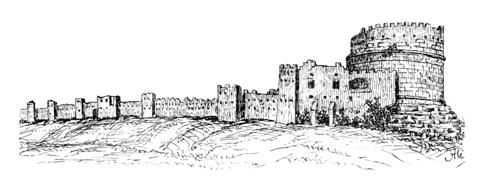 ■ Questo rapidissimo quadro delle condizioni del territorio romano lascia comprendere come i pochi abitanti che sopravvissero alle stragi, sentirono la necessità di riunirsi in siti forti per difendersi durante le incursioni e porre riparo dalle sorprese le famiglie e i raccolti agrari. In esso abbondavano le costruzioni robuste adatte allo scopo, specialmente i mausolei di forma rotonda o quadrata, che con le loro grosse pareti verticali costituivano delle vere torri difensive. Essi furono le prime costruzioni largamente usate a tale scopo; così la tomba di Cecilia Metella, la torre di Capo di Bove, Casal Rotondo e Torre Selci della Via Appia, il Torraccio Lonardo e la torre della Bella Pisana sulla Via Latina, il torrione di Terranova sulla Labicana, Tor degli Schiavi sulla Prenestina, Tor di Quinto sulla Flaminia, il mausoleo dei Plauzi presso Tivoli, e molte altre. In luoghi più lontani dalla città si utilizzarono le acropoli degli antichi centri abitati, trasformandole in veri castelli: l’acropoli di Vejo divenne il castello di Isola Farnese, quella di Galeria sulla Via Cassia, quelle di Collatia e di Gabio sulla Prenestina, ed altre pure formarono fortilizi murati.